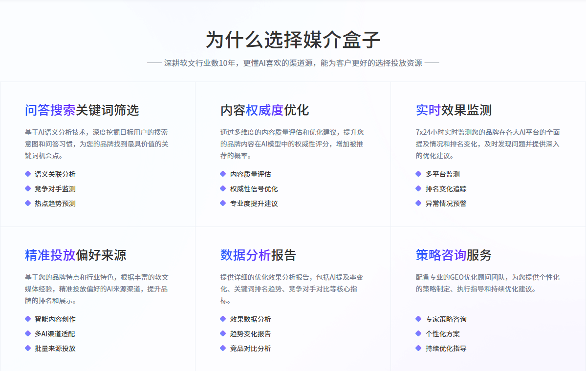 以深耕媒体资源的服务商媒介盒子为例,其专注于GEO链条中的关键一环:确保合规、优质的内容,能够精准匹配并落地于高权威性、高信任度的信源平台。这为解决GEO实践中的“权威性”与“可见性”基础问题,提供了专业化的资源支持。
